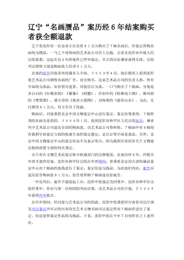 遼寧“名畫贗品”案歷經6年結案購買者獲全額退款(20.82KB)