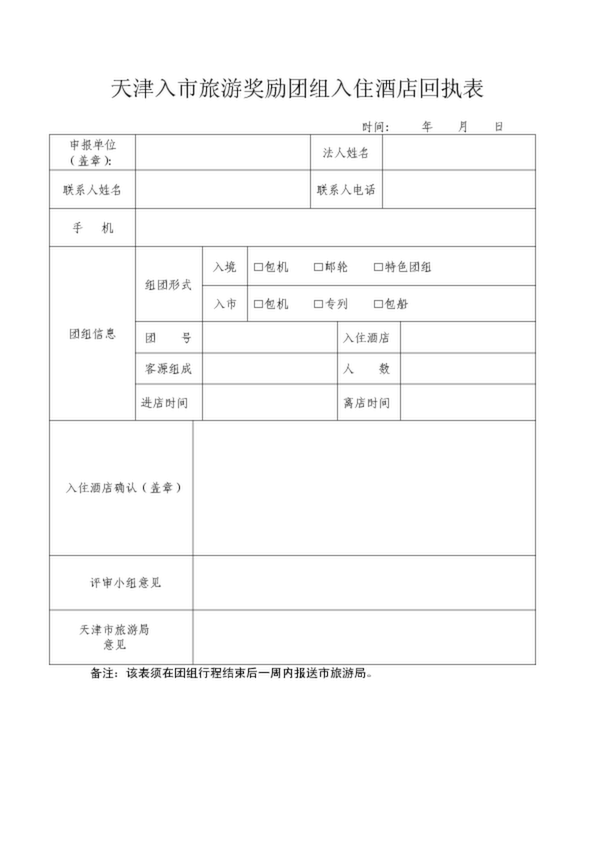天津入市旅游獎勵團組入住酒店回執表