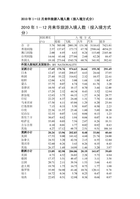 2010年1-12月來華旅游入境人數(按入境方式分)