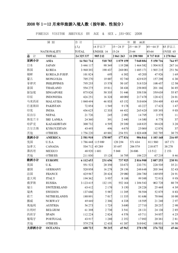 2008年1-12月來華旅游入境人數(按年齡、性別分)(0.14MB)