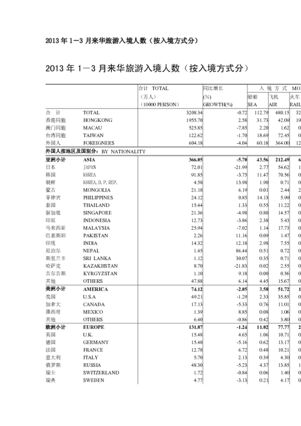 2013年1-3月來華旅游入境人數(shù)(按入境方式分)